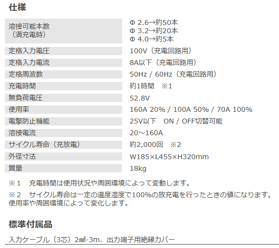品名、形式 イクラ ポータブルバッテリー溶接機 ISK-Li160A 溶接可能本数 (満充電時) φ2.6→約50本 φ3.2→約20本 φ4.0→約5本 定格入力電圧 100V(充電回路用) 定格入力電流 8A以下(充電回路用) 定格周波数 50Hz/60Hz(充電回路用) 充電時間 約1時間 ※1 無負荷電圧 52.8V 使用率 160A 20% /100A 50% /70A 100% 電撃防止機能 25V以下 ON/OFF切替可能 溶接電流 20A〜160A サイクル寿命(放電時) 約2000回 ※2 外径寸法 W185xL455xH320mm 質量 18kg 標準付属品 入力ケーブル(3芯)2mm2-3m、 出力端子用絶縁カバー メーカー 育良精機株式会社 送料区分 送料無料(北海道、沖縄、離島は別途扱いとなります。