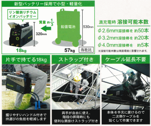 IKURA 育良精機 ライトアーク ポータブルバッテリー溶接機 ISK-Li160A コードレスですぐ溶接 ポータブルバッテリー溶接機 電源いらずで、いつでも、どこでも、すぐ溶接 バッテリーを常に監視する安全回路 過放電および過充電に対する警告や充電の制御を行いバッテリーの劣化を防ぐ、バッテリーマネージメントシステム(BMS)搭載。